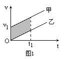 解析 本题属相遇问题,求解方法可以用公式(代数法),分别列出甲、乙的位移方程及相遇时的位移关系方程,再联立求解、讨论.也可以用图像法(几何法),结合v-t图像分析,这种方法很直观,尤其是本题只需进行定性判断,用图像法能迅速求解. 解法一:公式法 设经时间t,甲、乙相遇,时间t内甲、乙位移分别为: s1=v1t+ s2= 相遇时位移满足s1=s2+s (3) 由(1)(2)(3)解得 (a1-a2)t2+2v1t-2s=0 (4) 讨论:①当a1=a2时,(4)变为一元一次方程,t有一解t= ②当a1≠a2时,(4)为关于时间t的一元二次方程,由求根公式得 t= 当a1>a2时,t的两个根中一正一负,合理解为t>0,故只有一个解,即只能相遇一次. 当a1<a2时, t= 这时解的情况比较复杂.若Δ=4 根据以上分析,本题选A、C、D 解法二:图像法 我们画出满足题给条件的v-t图像. 图1对应a1=a2的情况,两条图线平行,两物体仅在t=t1时相遇一次.图中阴影部分面积为S.