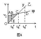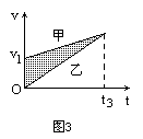 在图3对应a1<a2的情况,若在两条图线的交点对应的时刻t3两物体相遇,则仅相遇一次.图中阴影部分面积为S.若图中阴影面积小于S,由甲、乙不可能相遇.若图中阴影部分面积大于S,则可能相遇两次.