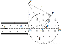 如图所示,水平放置的两块金属板平行正对,板间距为d,电压为U;两板间存在垂直于纸面向里、磁感应强度大小为B1的匀强磁场.图中右边有一半径为R、圆心为O的圆形区域,区域内存在垂直于纸面向里、磁感应强度大小为B2的匀强磁场.一电荷量为q的正离子沿平行于金属板面、垂直于磁场的方向从左侧正中央射入平行金属板间,恰好沿同一方向射出平行金属板间,并沿直径CD方向射入圆形磁场区域,最后从圆形区城边界上的F点射出.已知正离子从F点射出时速度方向与射入方向偏转的角度为θ=60°,不计正离子的重力.求(1)正离子速度的大小;