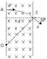 如图所示,一束电子(电荷量为e)以速度v从A点垂直射入磁感应强度为B,宽为d的匀强磁场中,从C点穿出磁场时速度方向与电子原来入射方向的夹角为30°,求:(1)电子的质量;