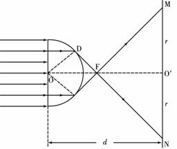 投影仪的镜头是一个半球形的玻璃体,光源产生的单色平行光投射到平面上,经半球形镜头折射后在光屏MN上形成一个圆形光斑。已知镜头半径为R,光屏MN到球心O的距离为d(d>3R),玻璃对该单色光的折射率为n,不考虑光的干涉和衍射。求光屏MN上被照亮的圆形光斑的半径。