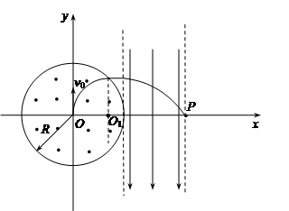 之间有向y轴负方向的匀强电场,在原点O有一离子源向y轴正方向发射速率为v0的带电离子,离子射出磁场时速度与x轴平行,射出磁场一段时间后进入电场,最终从x轴上的P(R+L,0)点射出电场,不计离子重力,求电场强度E与磁感应强度B的比值。