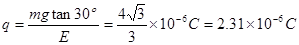 (8分)用30cm的细线将质量为4×10-3㎏的带电小球P悬挂在O点下,当空中有方向为水平向右,大小为1×104N/C的匀强电场时,小球偏转30°后处在静止状态。(1)分析小球的带电性质(2)求小球的带电量(3)求细线的拉力![]()