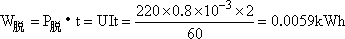 从表中可以看到工作电压就是我们国家的民用交流电,洗涤电动机的工作功率为110 W,脱水电机的功率为176 W,从洗衣机洗涤的正、反转和停的时间程序图可知,停和转的时间分别为125 s和775 s (4分) 所以洗涤时所用的电为:W洗涤=P洗涤t=UIt=220×0.5×10-3×0.215=0.0237 kWh (4分) 脱水时所用的电为: 洗衣机洗一次衣服用的电为:W=W洗衣+W脱水=0.0237+0.0059=0.03 kWh (3分) |