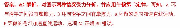 (2013哈尔滨三中月考)如图所示,两个倾角相同的滑竿上分别套有A、B两个圆环,两个圆环上分别用细线悬吊两个物体C、D,当它们都沿滑竿向下滑动时A的悬线与杆垂直,B的悬线竖直向下。下列说法正确的是: