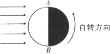 如图所示,太阳光照射到地球上,地球左半球为白天,右半球为黑夜,地球自西向东转(见图中箭头方向),A点表示清晨,B点表示傍晚.在A点向东或向西,在B点向东飞行均不能看到“太阳从西边升起”的奇妙现象.只有在B点向西飞行(即追赶快落山的太阳)能满足题意. |