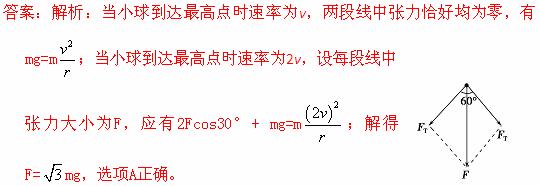 (2013山西忻州一中检测)如图两段长均为L的轻质线共同系住一个质量为m的小球,另一端分别固定在等高的A、B两点,A、B两点间距也为L,今使小球在竖直平面内做圆周运动,当小球到达最高点时速率为v,两段线中张力恰好均为零,若小球到达最高点时速率为2v,则此时每段线中张力大小为