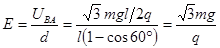 (8分)如图所示,用长为l的绝缘细线拴一个质量为m、带电量为 +q的小球(可视为质点)后悬挂于O点,整个装置处于水平向右的匀强电场E中。将小球拉至使悬线呈水平的位置A后,由静止开始将小球释放,小球从A点开始向下摆动,当悬线转过60°角到达位置B时,速度恰好为零。求: