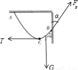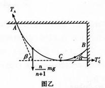 如图所示,质量为m的匀质细绳,一端系在天花板上的A点,另一端系在竖直墙壁上的B点,平衡后最低点为C点.现测得AC段绳长是〔B段绳长的n倍,且绳子B端的切线与墙壁的夹角为a.试求绳子在C处和在A处的弹力分别为多大?(重力加速度为g)