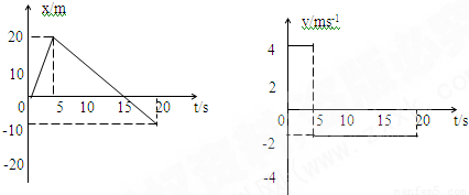 在距离斜坡底端10m的山坡上,一辆小车以4m/s的速度匀速向上行驶,5s后,小车又以2m/s的速度匀速向下行驶.设小车做直线运动且位移和运动方向都以沿斜坡向上为正方向,试作出小车在这20s内的x-t图象和v-t图象,并确定小车在20s末的位置.(小车初始位置为坐标原点.)