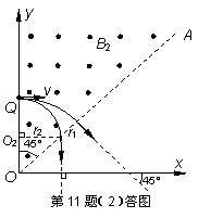 当通过x轴时的速度方向与x轴正方向夹角为90°时,由几何关系可知运动半径 r2=0.1m 由牛顿第二定律有