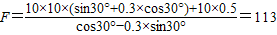 如图所示,在固定的、倾角为30°的斜面上有一个10kg的物体,它与斜面间的动摩擦因数为0.30.水平力F作用于物体上,欲使物体沿斜面以0.50m/s2的加速度上升,推力F应为多大?(g=10m/s2)