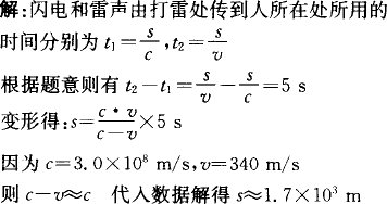 光在空气中传播的速度约等于3.0×108 m/s,声音在空气中的传播速度是340 m/s,一个人看到闪电后5 s听到雷声,则打雷的地方离他大约多远?
