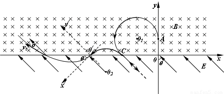 (3)粒子从第三次过x轴到第四次过x轴的过程是在电场中做类平抛的运动,采用运动的分解,由牛顿定律和运动学公式求解第四次穿越x轴时速度的大小及速度方向与电场方向的夹角.