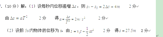 (10分)一物体做匀加速直线运动,初速度为0.5 m/s,第7 s内的位移比第5 s内的位移多4 m,求:(1)物体的加速度;(2)物体在前5 s内的位移。