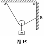(10分)如图15所示,将一条轻而柔软的细绳一端固定在天花板上的A点,另一端固定在竖直墙上的B点,A和B到O点的距离相等,绳长为OA的两倍.滑轮的大小与质量均可忽略,滑轮下悬挂一质量为m的重物.设摩擦力可忽略,求平衡时绳所受的拉力为多大?