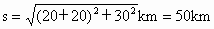 轮船从东海岸出发,向东航行20km后,又向北航行了30km,接着又向东航行了20km,求轮船的位移.