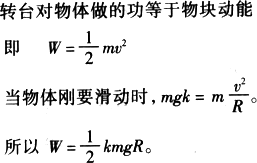 相距R,物块随转台由静止开始转动,当转速增加到一定值时,物块即将在转台上滑动,在物块由静止到开始滑动前的这一过程中,转台对物块做的功为