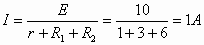 解:(1) (2)电容器两端的电压即R2两端的电压: U2=IR2=1×6=6 V 开关S断开后,电容器两端的电压为10 V,则通过R1的电量为 Q=C(E-U2)=1.2×10-4 C |