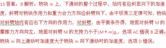 (2013年3月吉林二模)如图所示,斜劈形物体的质量为M,放在水平地面上,质量为m的粗糙物块以某一初速沿斜劈的斜面向上滑,至速度为零后又加速返回,而斜劈始终保持静止,物块m上、下滑动的整个过程中