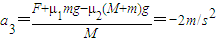 【答案】分析:(1)木板匀速运动,由平衡条件可得:F=μ2Mg 即可求得木板与地面的动摩擦因数μ2;