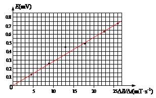 (2)该实验小组利用两组图像求出六组磁感应强度变化率(ΔB/Δt)和对应的感应电动势E的数据,并建立坐标系,描出的六个点如图(c)所示。请在图(c)中绘出E-ΔB/Δt的图线;