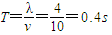 【答案】分析:根据t=0时刻这列波的波形图和该波向右传播可以判定a点向下振动,然后根据波速、波长、周期之间关系,求出周期即可.