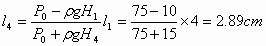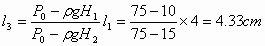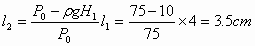 ①玻璃管内的空气作等温变化,管内外水银面恰好相平时 (p0-r gH1)Sl1=p0Sl2(2分) ②(a)若管内水银面较高,管内气柱长l3 (p0-r gH1)Sl1=(p0-r gH3)Sl3(1分) 玻璃管上移的距离x2=H3+l3-(l1+H1)=15+4.33-(4+10)=5.33 cm(1分) (b)若管外水银面较高,管内气柱长l4 (p0-r gH1)Sl1=(p0+r gH4)Sl4(1分) 玻璃管下移的距离x4=l1+H1+H4-l3=4+10+15-2.89=26.11 cm(1分) |