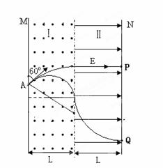 (2012湖北省重点中学联考)如图所示,真空室内竖直条形区域I存在垂直纸面向外的匀强磁场,条形区域Ⅱ(含I、Ⅱ区域分界面)存在水平向右的匀强电场,电场强度为E,磁场和电场宽度均为L且足够长,M、N为涂有荧光物质的竖直板。现有一束质子从A处连续不断地射入磁场,入射方向与M板成60°夹角且与纸面平行,质子束由两部分组成,一部分为速度大小为v的低速质子,另一部分为速度大小为3v的高速质子,当I区中磁场较强时,M板出现两个亮斑,缓慢改变磁场强弱,直至亮斑相继消失为止,此时观察到N板有两个亮斑。已知质子质量为m,电荷量为e,不计质子重力和相互作用力,求:
