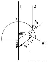 解答:解:(1)光线1通过玻璃砖后不偏折.光线2在圆柱面上的入射角θ1=60°,由折射定律得