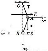 【答案】分析:运用整体法研究OA绳与竖直方向的夹角,再隔离B研究,分析AB绳与竖直方向的夹角,得到两夹角的关系,判断系统平衡状态.