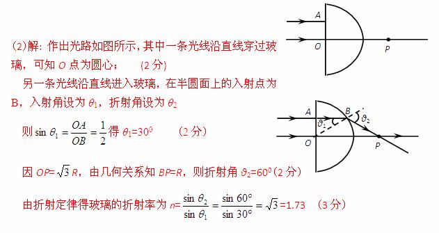 (2013江西省吉安市七校联考)两束平行的细激光束,垂直于半圆柱玻璃的平面射到半圆柱玻璃上,如图所示。已知其中一条光线沿直线穿过玻璃,它的入射点是O;另一条光线的入射点为A,穿过玻璃后两条光线交于P点。已知玻璃截面的圆半径为R,OA=