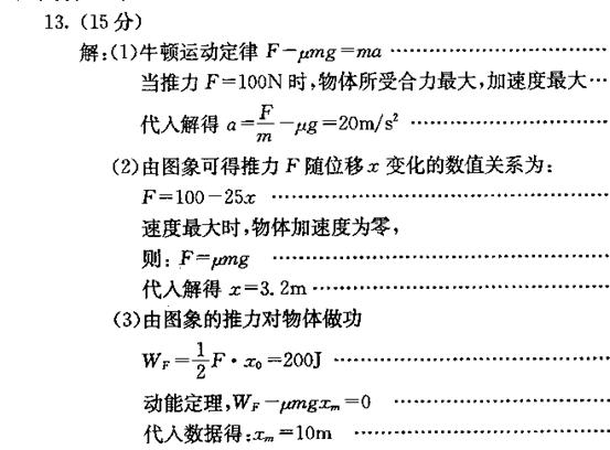 2011年3月11日,日本大地震以及随后的海啸给日本带来了巨大的损失。灾后某中学的部分学生组成了一个课题小组,对海啸的威力进行了模拟研究,他们设计了如下的模型:如图甲在水平地面上放置一个质量为m=4kg的物体,让其在随位移均匀减小的水平推力作用下运动,推力F随位移x变化的图像如图乙所示,已知物体与地面之间的动摩擦因数为μ=0.5,g=10m/s2。![]()
