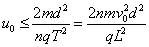 长为L、相距为d的两平行金属板与一交流电源相连(图中未画出),有一质量为m、带电量为q的带负电的粒子以初速度v0从板中央水平射入电场,从飞入时刻算起,A、B板间所加电压的变化规律如图所示,为了使带电粒子离开电场时速度方向恰好平行于金属板,问:加速电压值U0的取值范围多大?