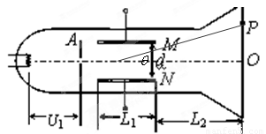 £¨11·Ö£©ÈçͼËùÊ¾ÎªÒ»Õæ¿Õʾ²¨¹Ü£¬µç×Ó´ÓµÆË¿K·¢³ö£¨³õËٶȲ»¼Æ£©£¬¾µÆË¿ÓëA°å¼äµÄ¼ÓËÙµçѹU1¼ÓËÙ£¬´ÓA°åÖÐÐÄ¿×ÑØÖÐÐÄÏßKOÉä³ö£¬È»ºó½øÈëÁ½¿éƽÐнðÊô°åM¡¢NÐÎ³ÉµÄÆ«×ªµç³¡ÖУ¨Æ«×ªµç³¡¿ÉÊÓΪÔÈÇ¿µç³¡£©£¬µç×Ó½øÈëM¡¢N¼äµç³¡Ê±µÄËÙ¶ÈÓëµç³¡·½Ïò´¹Ö±£¬µç×Ó¾¹ýµç³¡ºó´òÔÚÓ«¹âÆÁÉϵÄPµã¡£ÒÑÖª¼ÓËÙµçѹΪU1£¬M¡¢NÁ½°å¼äµÄµçѹΪU2£¬Á½°å¼äµÄ¾àÀëΪd£¬°å³¤ÎªL1£¬°åÓҶ˵½Ó«¹âÆÁµÄ¾àÀëΪL2£¬µç×ÓµÄÖÊÁ¿Îªm£¬µçºÉÁ¿Îªe¡££¨²»¼ÆÖØÁ¦£©Çó£º
