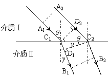 一列平面波朝着两种介质的界面传播,A1A2是它在介质Ⅰ中的一个波面,A1C1和A2C2是它的两条波线,其入射角为530,C1和C2位于两种介质的界面上。B1B2是这列波进入介质Ⅱ后的一个波面。已知A1A2的长度是0.6m,介质Ⅰ与介质Ⅱ中的波速之比为4:3,问A1C1B1与A2C2B2的长度相差多少?
