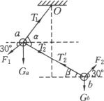 用轻质细线把两个质量未知的小球悬挂起来,如图所示.今对小球a持续施加一个向左偏下30°的恒力,并对小球b持续施加一个向右偏上30°的同样大的恒力,最后达到平衡.表示平衡状态的图可能是图中的( ).