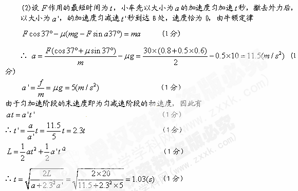 (2)用大小为30N,与水平方向成37°的力斜向上拉此物体,使物体从A处由静止开始运动并能到达B处,求该力作用的最短时间t。