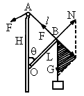 取 BO杆的B端为研究对象,受到绳子拉力(大小为F)、BO杆的支持力N和悬挂重物的绳子的拉力(大小为G)的作用,将N与G合成,其合力与F等值反向,如图所示,得到一个力的三角形(如图中画斜线部分),此力的三角形与几何三角形OBA相似,可利用相似三角形对应边成比例来解.如图所示,力的三角形与几何三角形 OBA相似,设AO高为H,BO长为L,绳长为l,则由对应边成比例可得:式中 G,H,L均不变,l逐渐变小,所以可知N不变,F逐渐变小.正确答案为选项 B.此题是运用数学知识,判断力三角形与几何三角形相似,从而用相似三角形法求解的问题.如果已知条件中有某几何长度,或已知几何长度的变化,往往用相似三角形法求解. |