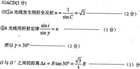 £¨2£©°ë¾¶ÎªRµÄ°ëÇòÐνéÖʽØÃæÈçͼËùʾ£¬DΪԲÐÄ£¬Í¬Ò»ÆµÂʵĵ¥É«¹âa¡¢bÏ໥ƽÐУ¬´Ó²»Í¬Î»ÖýøÈë½éÖÊ£¬¹âÏßaÔÚOµãÇ¡ºÃ²úÉúÈ«·´É䣮¹âÏßbµÄÈëÉä½ÇΪ45¡ã£¬Çó£º