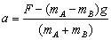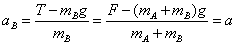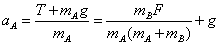 在外力F作用下,A、B运动的加速度为 此时轻弹簧对A与B的作用力为 T=mBg+mBa = 撤去外力F前,A、B受力情况如图3-1b所示.在撤去外力F的瞬间,轻弹簧的形变情况未发生明显变化,此时弹簧弹力T大小不变.A所受合力为T+mAg,B所受合力为T-mBg不变.此时A、B的加速度分别为 |