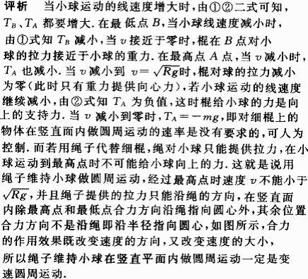 质量为m的小球,系在细棍的一端,手握细棍的另一端使小球在竖直平面内做匀速圆周运动,如图所示.圆半径30 cm,线速度为2.1 m/s,比较小球通过最高点和最低点时细棍对球的拉力(不计细棍质量).