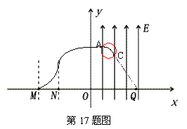 如图所示,直角坐标系的ox轴水平,oy轴竖直;M点坐标为(-0.3m,0)、N点坐标为(-0.2m,0);在 -0.3m ≤ X ≤ -0.2m的长条形范围内存在竖直方向的匀强电场E0;在X ≥0的范围内存在竖直向上的匀强电场,场强为E=20N/C;在第一象限的某处有一圆形的匀强磁场区,磁场方向垂直纸面向外,磁感应强度B=2.5T。有一带电量q =+1.0×10-4C、质量m=2×10-4kg的微粒以v0=0.5m/s的速度从M点沿着x轴正方向飞入电场,恰好垂直经过y轴上的P点(图中未画出, yP>0),而后微粒经过第一象限某处的圆形磁场区,击中x轴上的Q点,速度方向与x轴正方向夹角为600。g取10m/s2。求:
