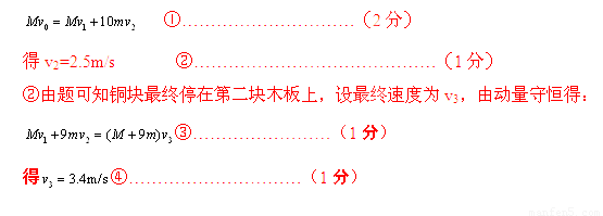 如图所示,水平光滑地面上依次放置着质量m=0.08kg的10块完全相同长直木板。一质量M=1.0kg大小可忽略的小铜块以初速度v0=6.0m/s从长木板左侧滑上木板, 当铜块滑离第一块木板时,速度大小为v1=4.0m/s。铜块最终停在第二块木板上。(g=10m/s2,结果保留两位有效数字)求: