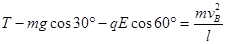 (3)小球到达B点时,悬线对小球的拉力T、重力沿半径方向的分力 mgcos30°、电场力沿半径方向的分力qEcos60°的合力是向心力:
