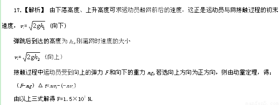 (10分)、蹦床是运动员在一张绷紧的弹性网上蹦跳、翻滚并做各种空中动作的运动项目.一个质量为60 kg的运动员,从离水平网面3.2 m高处自由下落,着网后沿竖直方向蹦回到离水平网面5.0 m高处.已知运动员与网接触的时间为1.2 s.若把在这段时间内网对运动员的作用力当作恒力处理,求此力的大小.(g=10 m/s2)?