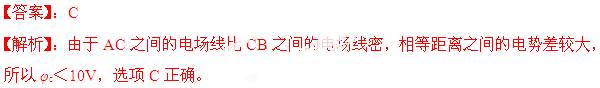 (湖北省荆门市2012-2013学年度高三元月调考)如图所示,在某电场中画出了三条电场线,C点是A、B连线的中点。已知A点的电势为φA=30V,B点的电势为φB=-10V,则C点的电势