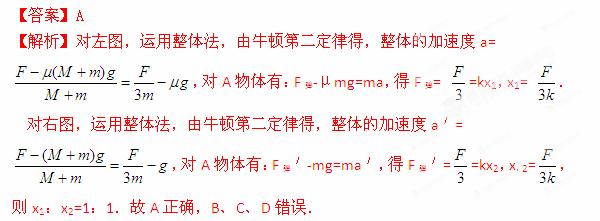 (2013山东师大附中质检)如图所示,在粗糙的水平面上,质量分别为m和M(m:M=1:2)的物块A、B用轻弹相连,两物块与水平面间的动摩擦因数相同,当用水平力F作用于B上且两物块共同向右加速运动时,弹簧的伸长量为x1;当用同样的大小的力F竖直加速提升两物块时,弹簧的伸长量为x2,则x1:x2等于