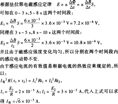 一个边长为6 cm的正方形金属线框置于匀强磁场中,线框平面与磁场垂直,电阻为0.36 Ω.磁感应强度B随时间t的变化关系如图所示,则线框中感应电流的有效值为
