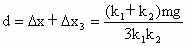 物体处于平衡状态,在竖直方向上所受的合外力为零.当上面的弹簧没有作用力时,下面弹簧对物体的支持力等于物体的重力,所以下面弹簧的压缩量为 当上面弹簧提起时,下面弹簧的弹力为物体重力的 下面弹簧两次压缩之差为 这说明了重物要上升 当提起 A端时,上面的弹簧伸长量为A 端竖直上提的高度等于下面弹簧压缩量的减少量和上面弹簧伸长量之和,如图所示.